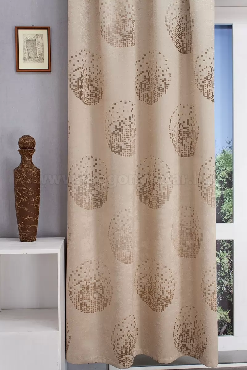 Modern berendezésekhez illik ez a dimout dekor, sötétítő függöny. Szövés módja miatt jó a dimout képessége. Egyik oldalán bársonyos, bézs alapon fénylő arany színű, apró mozaik szerű kör minta látható, a másik oldalon ez fordítva jelenik meg. A két oldal variálható egy mással. Ágytakaró, díszpárna is készíthető belőle. Kíméletes mosást, gőzölős vasalást igényel.