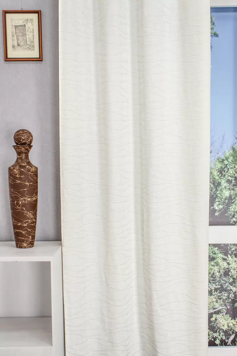 A hullámminták a növényi indákat és leveleket idézik, ezáltal lágyságot visznek függönyünk megjelenésébe. Az egyszínű, minta nélküli vagy szórt mintás kiegészítő textilek illenek hozzá legjobban.A tört fehér szín kellemes melegséggel árasztja el szobánkat