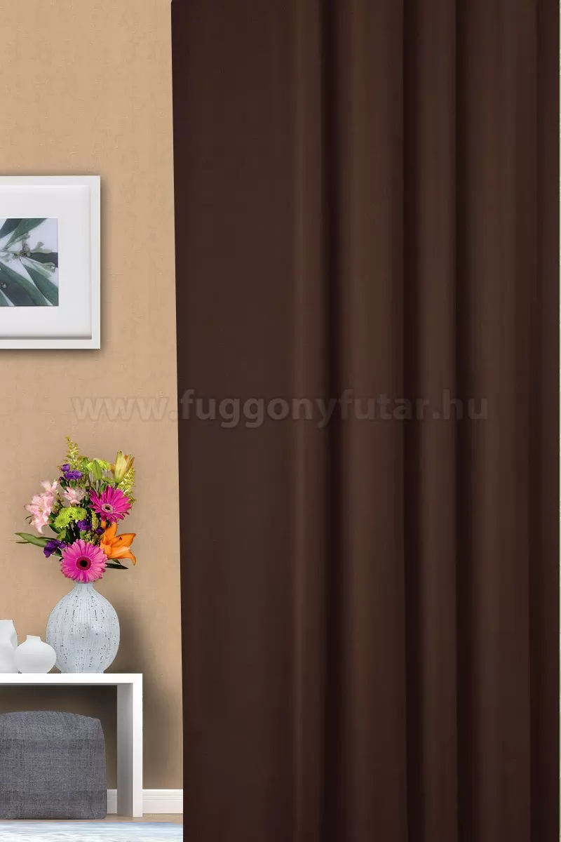 Sötétbarna színű, dimout szövésű dekoranyag, amely színvilága harmonikus és kellemes hangulatot teremt az otthonában. Jó minőségű, sűrűn szövött textil, melyen keresztül jóval kevésbé jut át a fény, ezért kiválóan alkalmazható sötétítő függönynek.