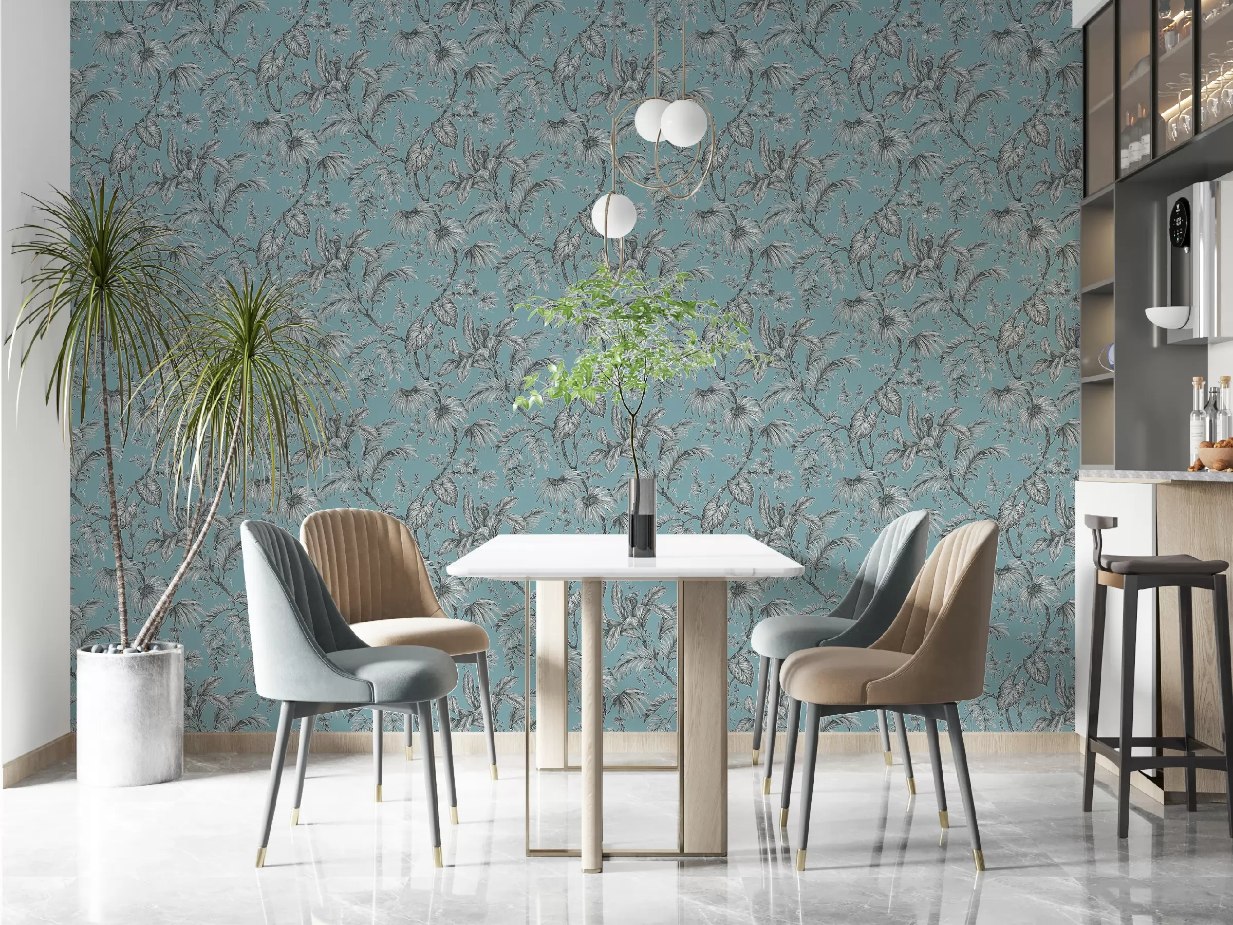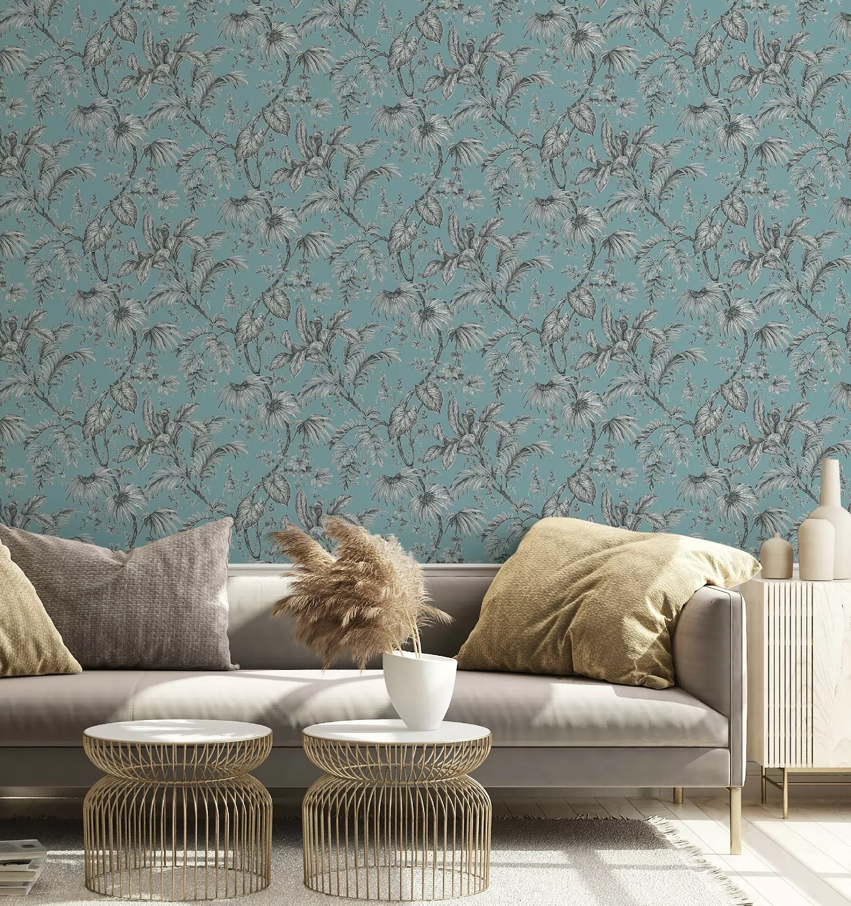 Türkiz alapon szürke növénymintás vlies tapéta, Marburg Jackie 6818-40
