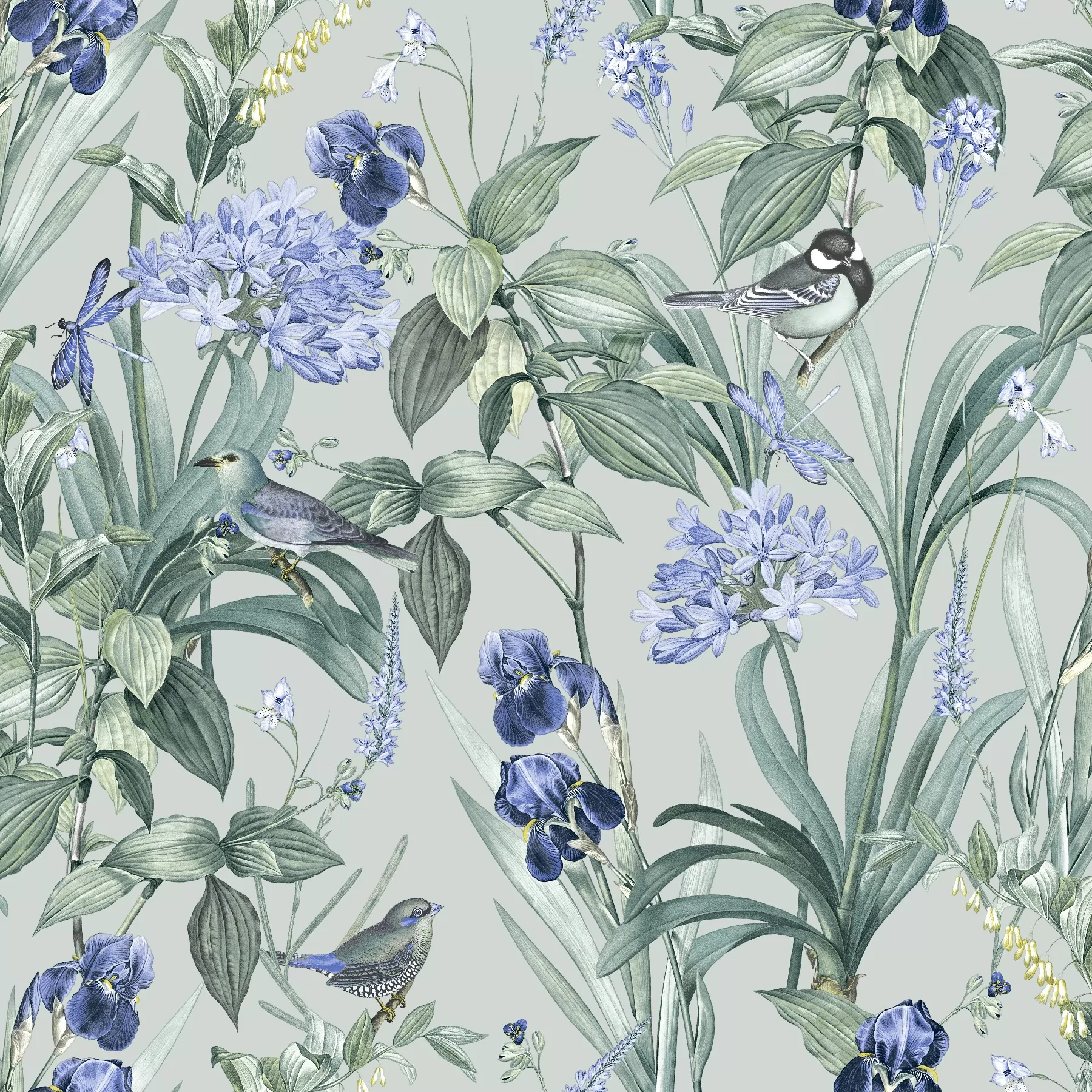 Világos szürke alapon zöld és kék virágmintás Vlies tapéta, Botanique M64714