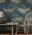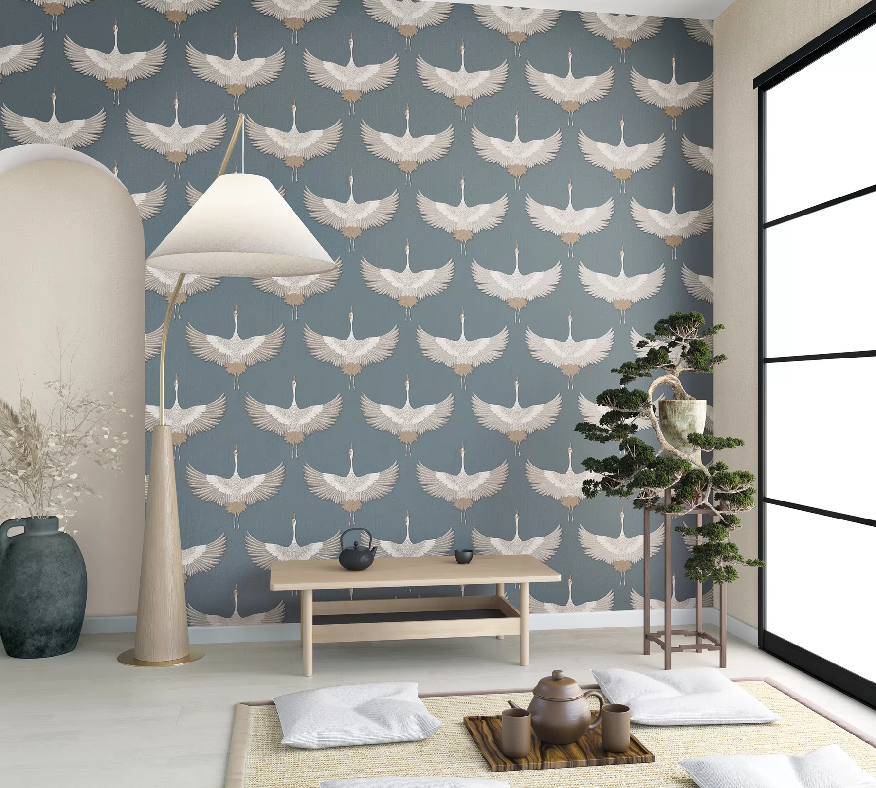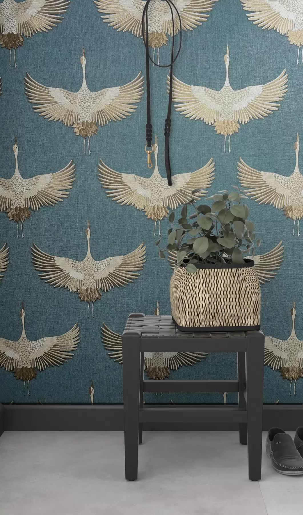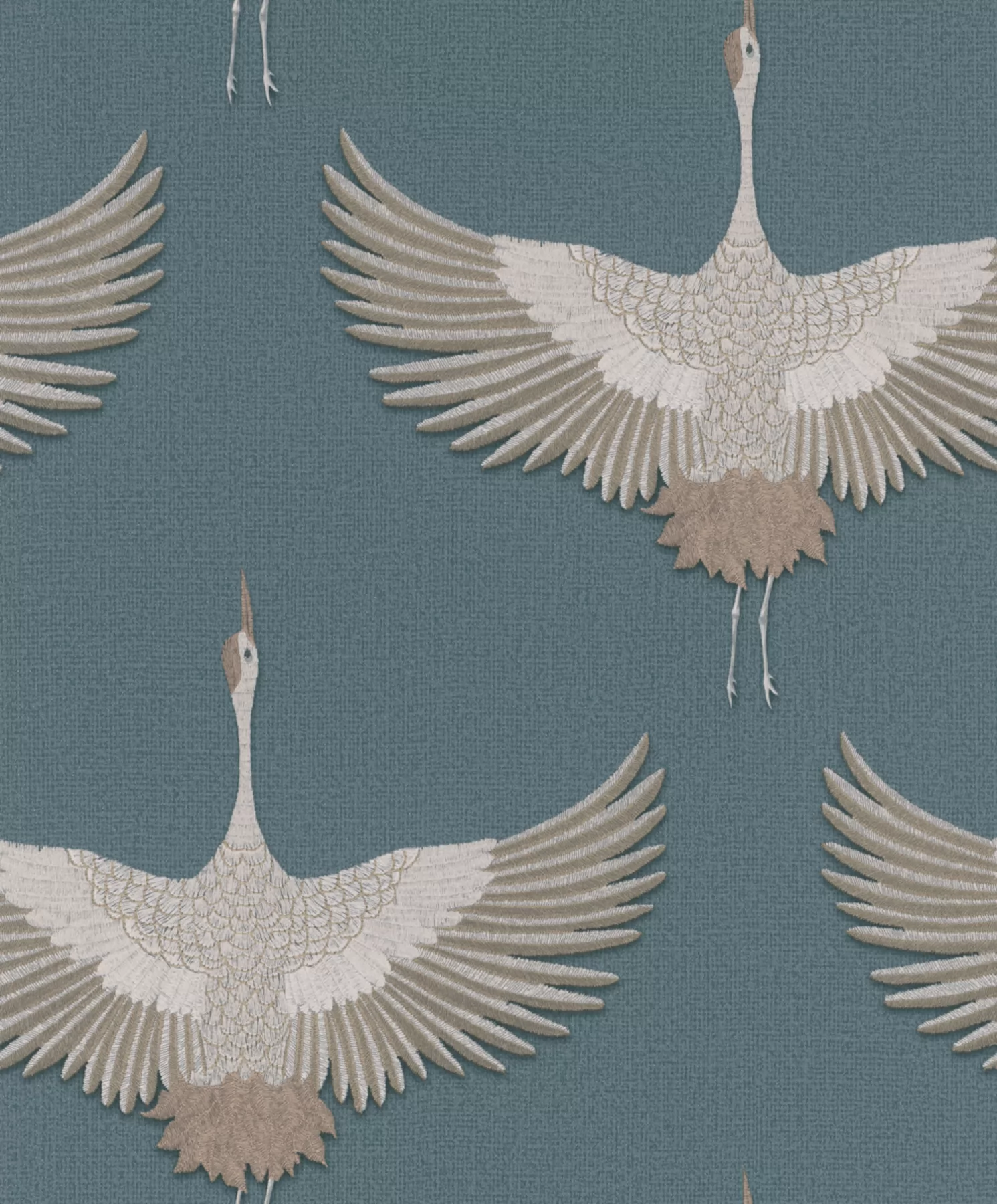 Türkiz alapon bézs színű darumadár mintás Vlies tapéta, Kumano 1834531