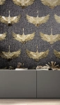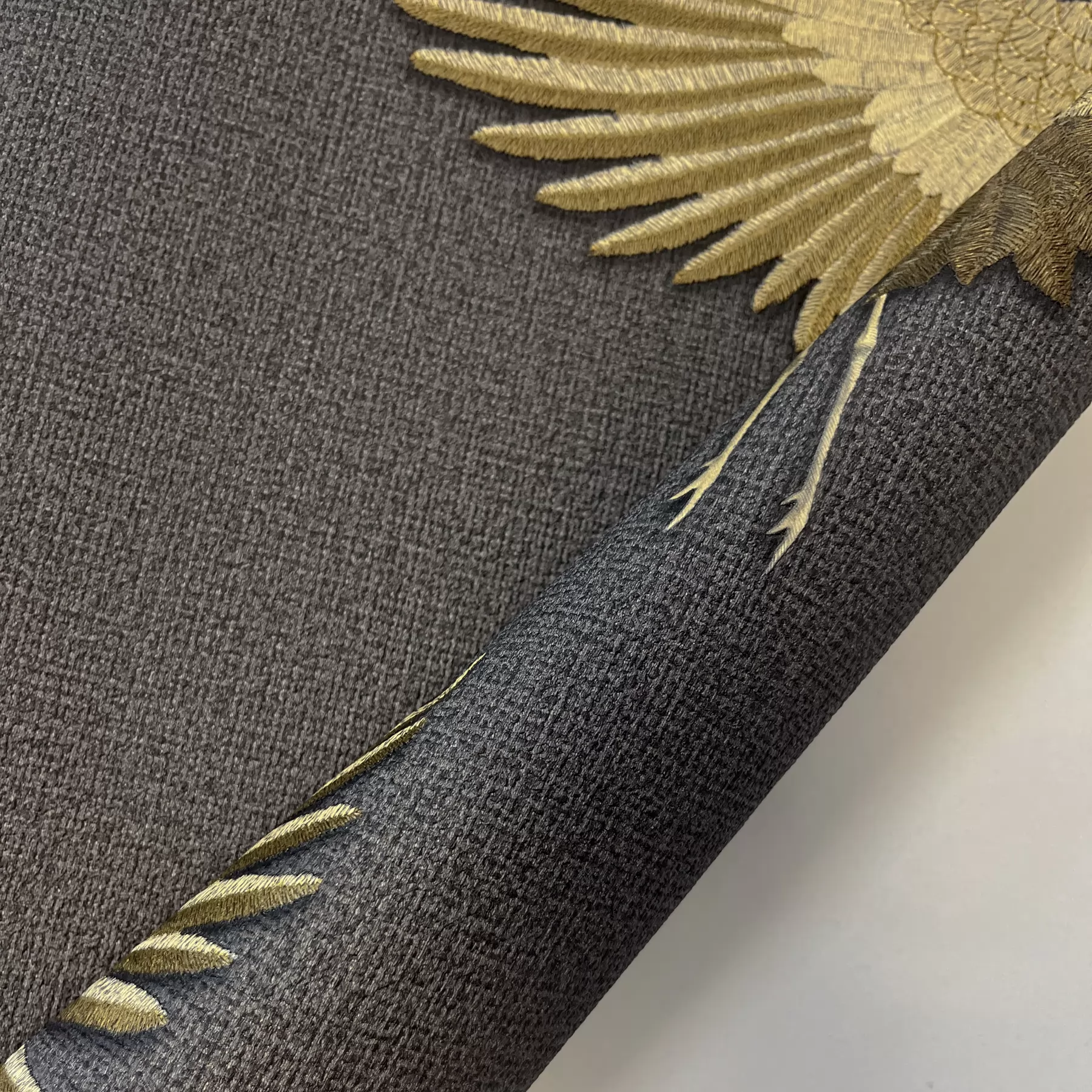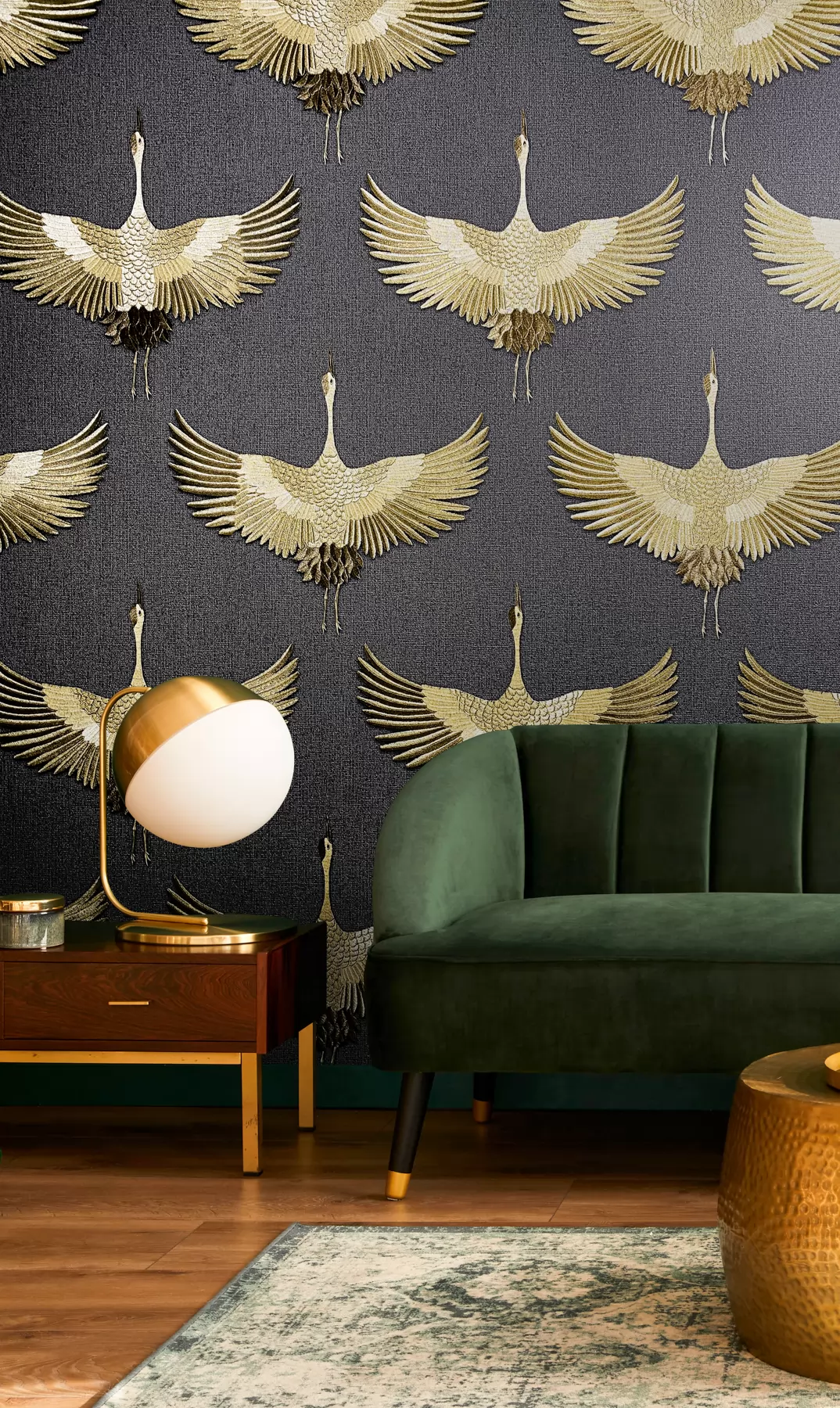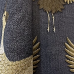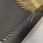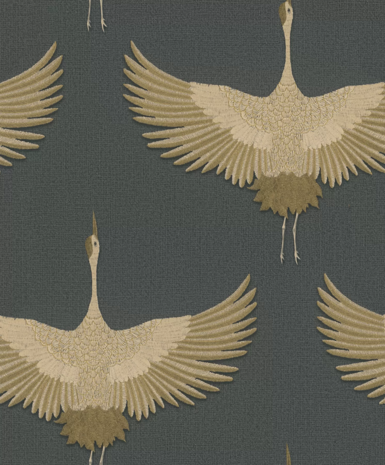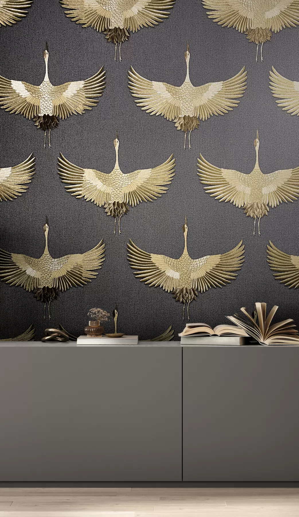 Sötétszürke alapon arany színű darumadár mintás Vlies tapéta, Kumano 1834532