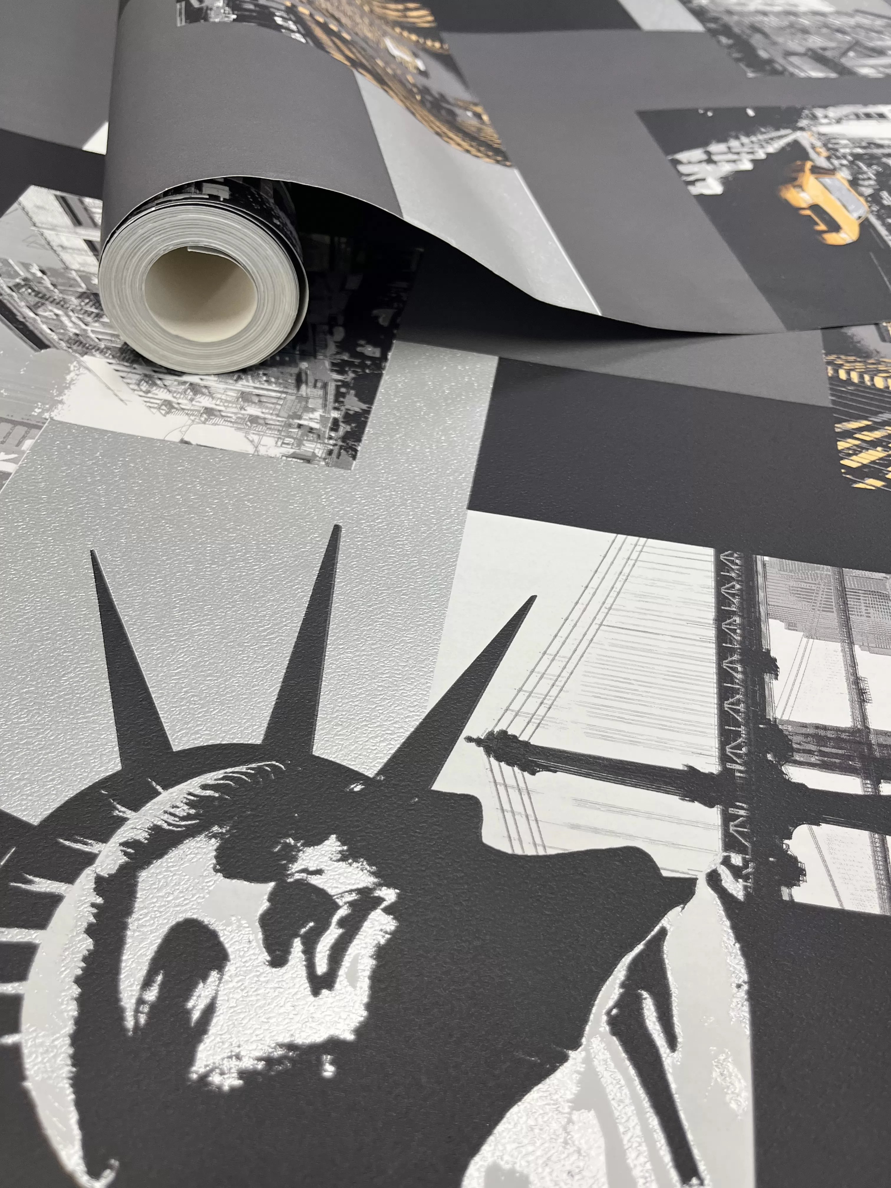New York-i hangulat - szürke-sárga papírtapéta fényes mintákkal