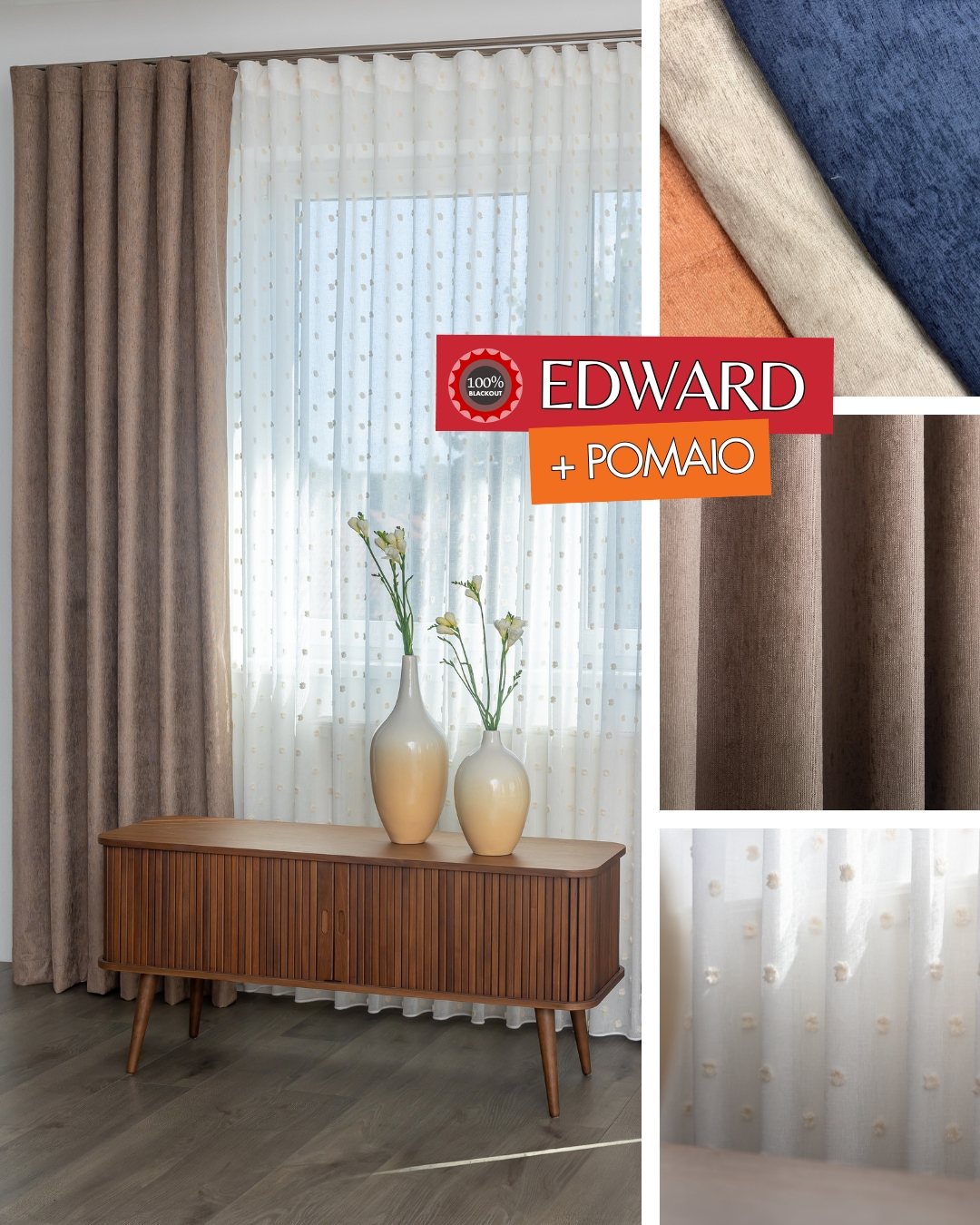 Edward kordbársony felületű blackout függöny és a Pomaio pompom mintás applikált sablé függönnyel mediterrán bohókás eleganciát hoz az otthonodba