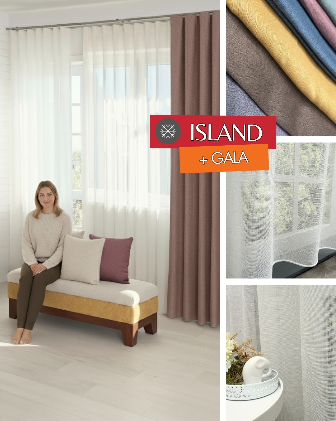 Island thermo dimout hőszigetelő dekorfüggöny és Gala rusztikus, természets hatású sablé függöny a funkcionális otthonok kényelmes, hosszútávú megoldása