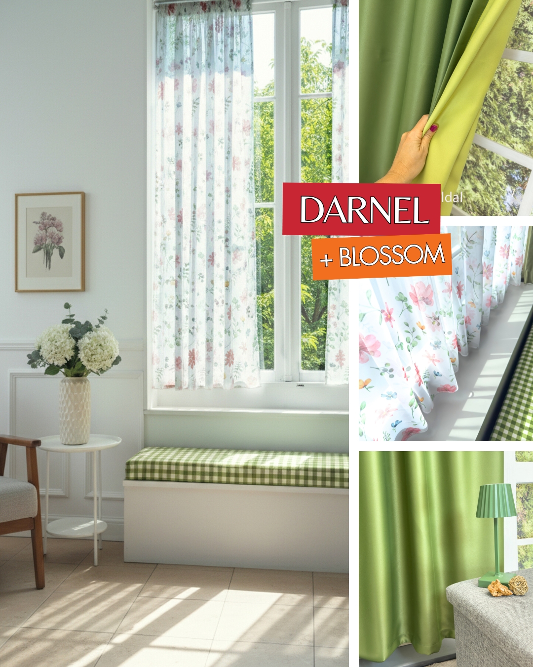 Darnel olivazöld kétoldalas dimout és a Blossom nyomott virágmintás voile függöny remek összeállítás étkezőbe és konyhába.