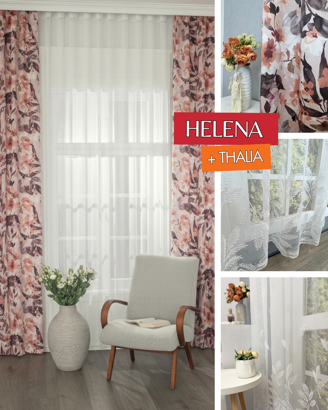 Helena - Mályva színű nyomott virágmintás szanténfényű dimout függöny és a Thaila - Fehér színű hímzett levélmintás sablé függöny igazi romantikus hangulatot teremt a szobában.