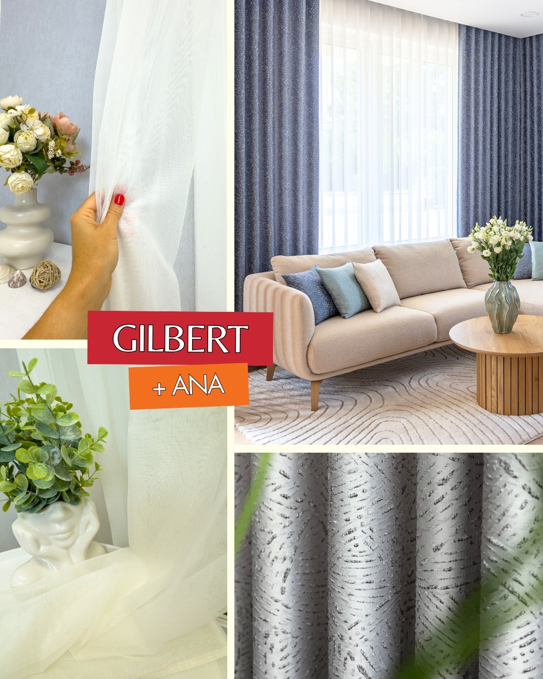 Gilbert szatéfényű jaquard dekorfüggöny eleganciáját remekül kiegészíti az Ana puhaszálú fényátreesztő kifinomultsága