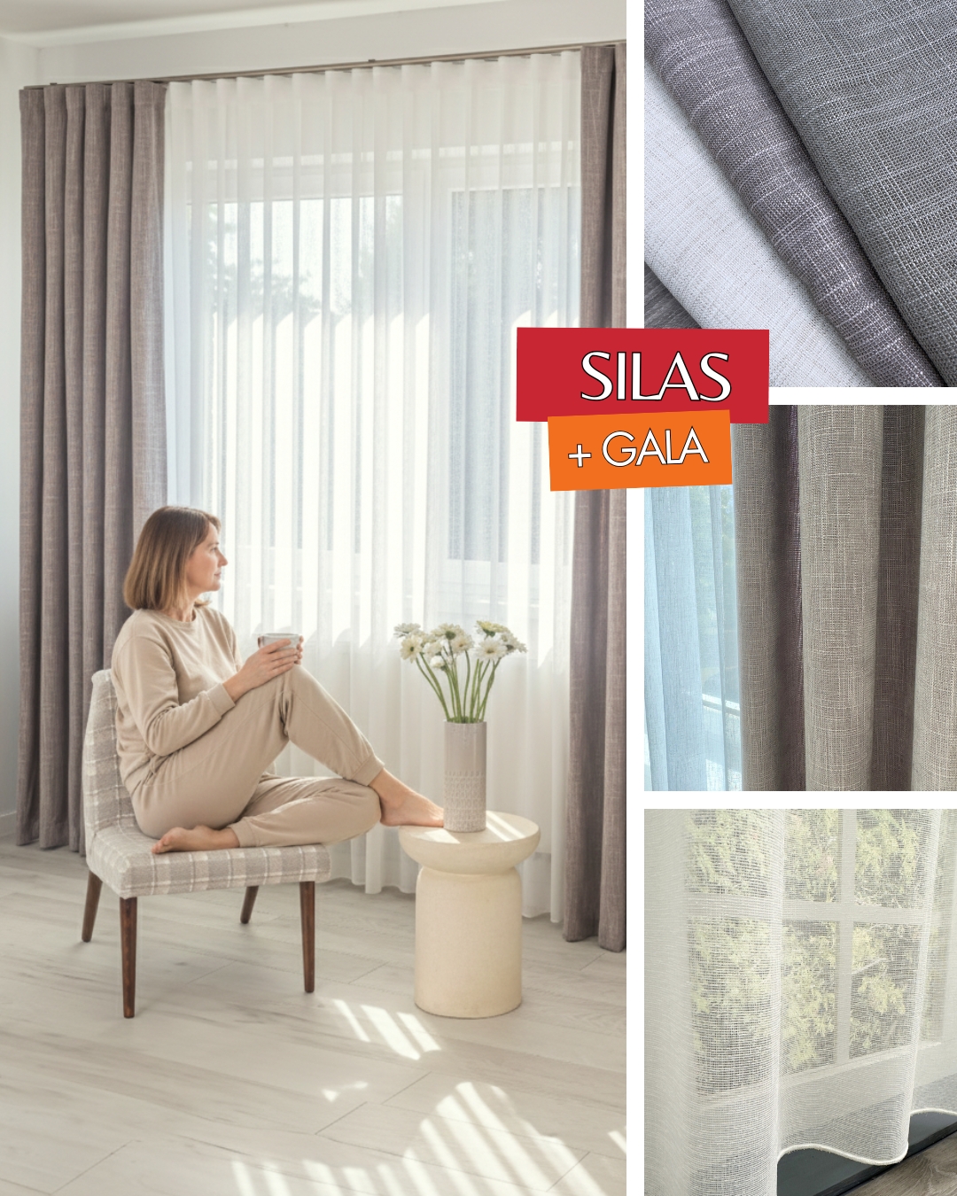 Silas puha tapintású, könnyű esésű dekorfüggöny és a Gala rusztikus sablé remek párost alkotnak, ha otthonunkban a természetesség és a mindennapi kényelem a központ.